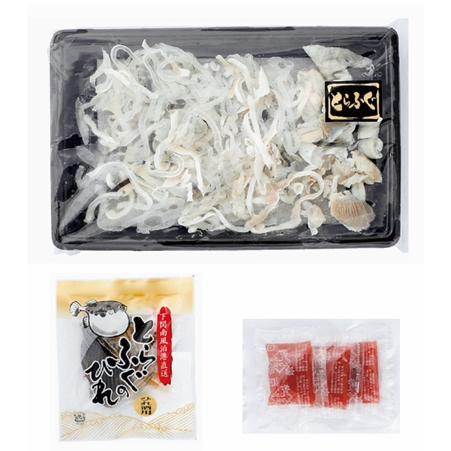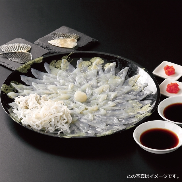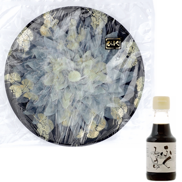 ■とらふぐ刺身(国産養殖)(130g)【菊盛プラ皿30cm】■とらふぐ皮湯引き(国産養殖)(100g)■とらふぐひれ酒用ひれ(国産養殖)(5g)■ふくしょうゆ(150ml)■もみじおろし(10g)×3