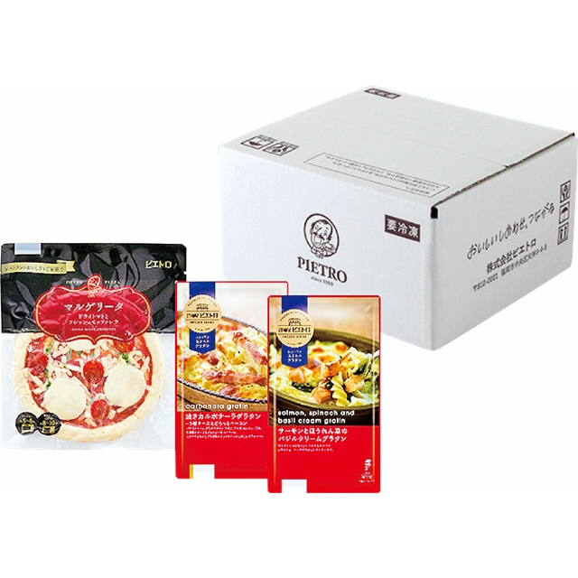 ピエトロレストラン仕込みのこだわり冷凍グラタンとマルゲリータピザのセット商品です。