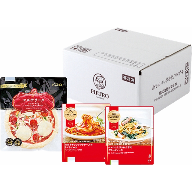 ピエトロレストラン人気メニューを商品化した冷凍パスタとマルゲリータピザのセット商品です。