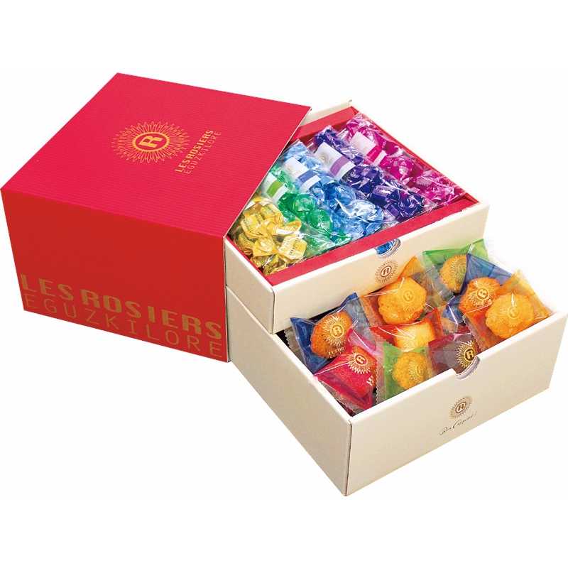 引き出しを開けると、ひと口サイズのカラフルなお菓子がたくさん!上の段には5種類のチョコレート。下の段には6種類の焼き菓子が。華やかなギフトボックスに仕上げました。