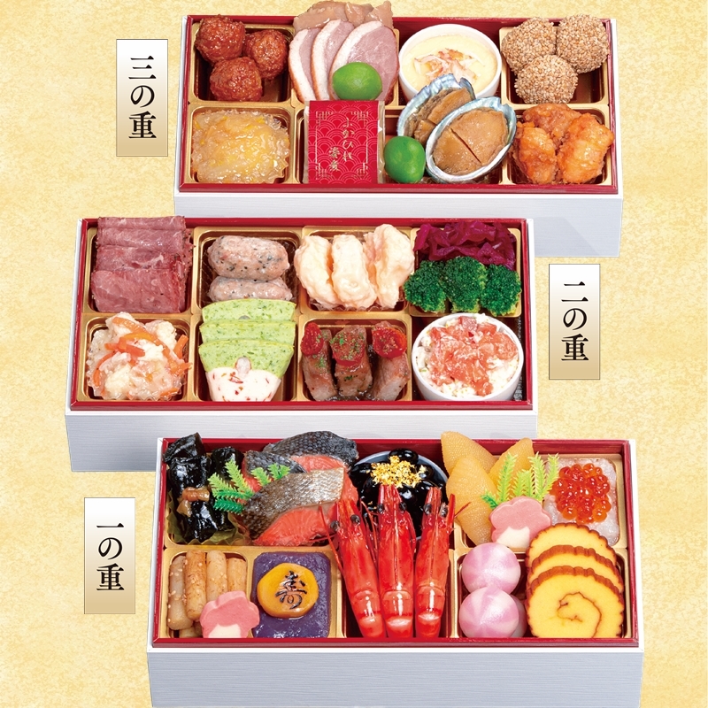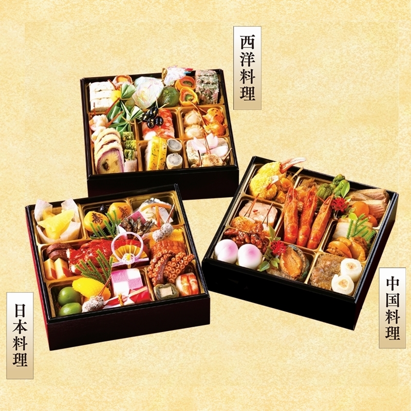 新春のお慶びの宴を彩る城西館のおせち料理三段重。厳選した素材でお造りし、それぞれのお重に彩りと趣を変えた味の数々を華やかに盛り込みました。