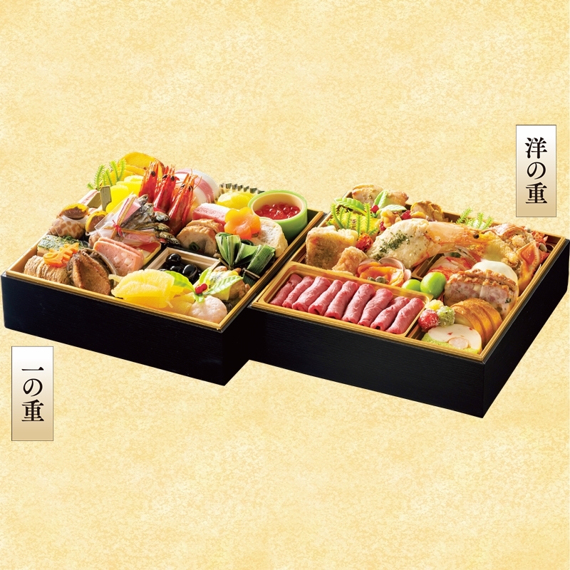 新春のお慶びの宴を彩る城西館のおせち料理ニ段重。厳選した素材でお造りし、それぞれのお重に彩りと趣を変えた味の数々を華やかに盛り込みました。