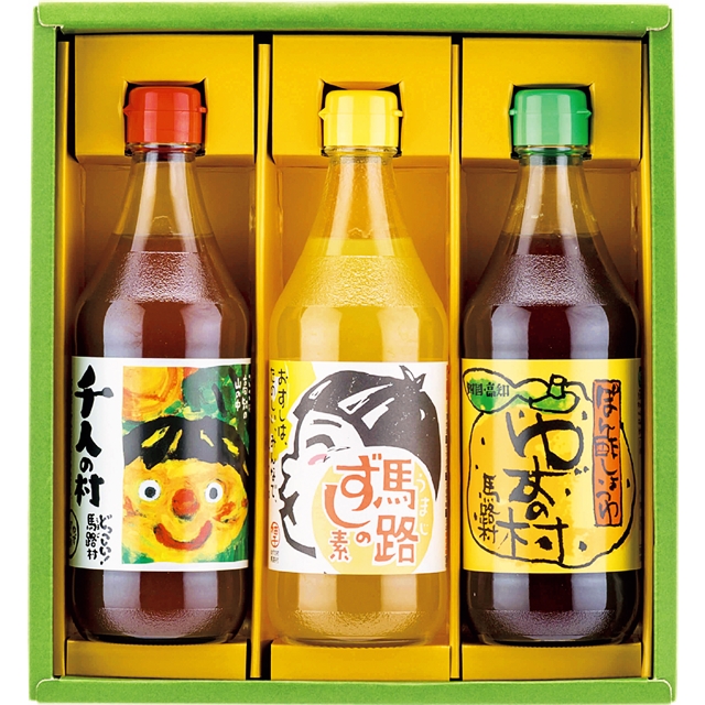 人気のぽん酢2種類とおすすめの「馬路ずしの素」を詰合せました。簡単時ゆず風味のチラシ寿司が作れます。またマリネやカルパッチョにもおすすめです。