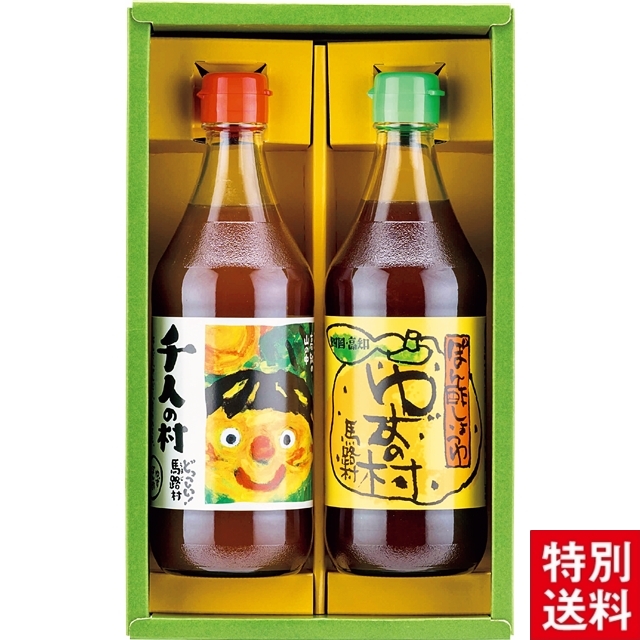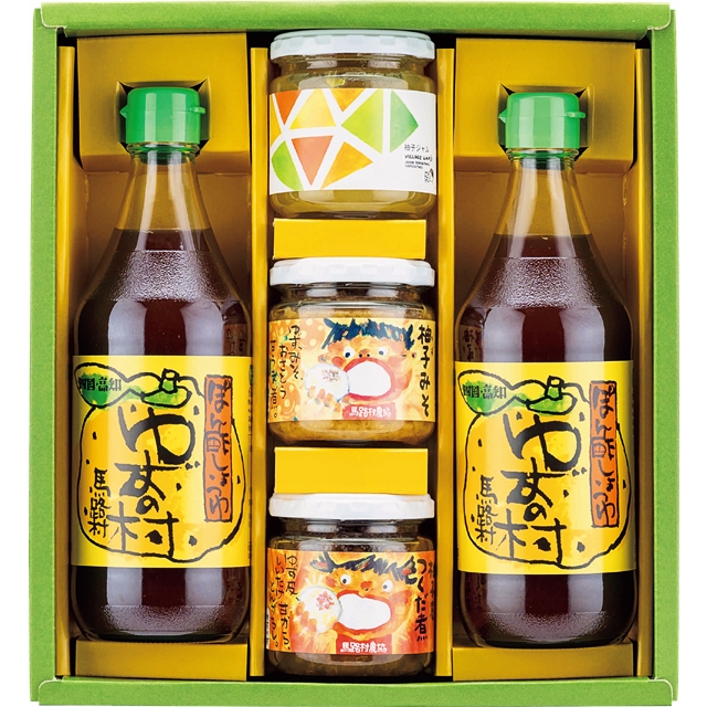 馬路村ベストセラー「ぽん酢しょうゆゆずの村」をイラスト付きの小箱に詰めお届けいたします。