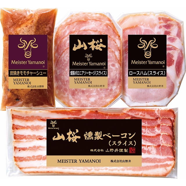 炭焼き製法にて仕上げた焼き豚とノンスモークで仕上げたハム、山桜で仕上げたベーコンなどをセットにしました。