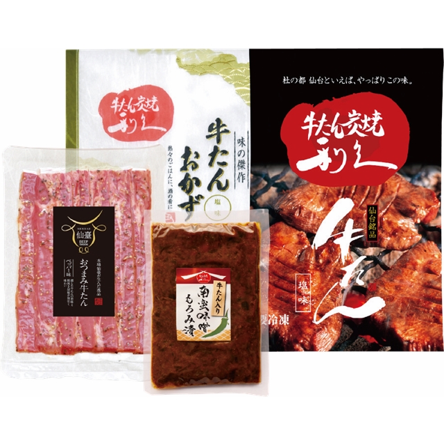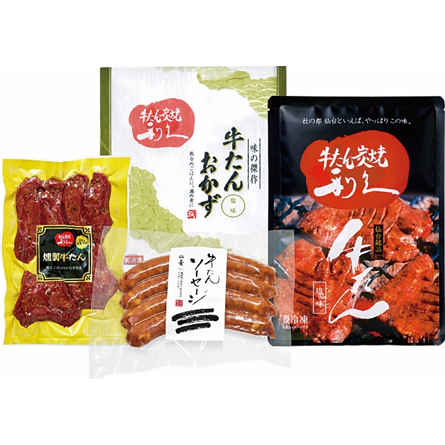 厚切り牛タンと牛タンおかず、さらに燻製牛タンと牛タンソーセージをセットした彩ある詰合せです。