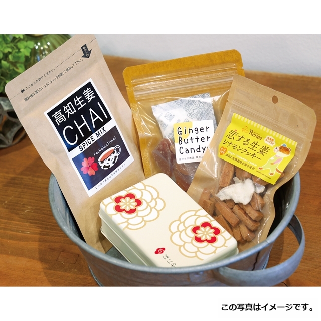高知の生姜を使ったお菓子とチャイのセットに、ほにやオリジナルふきよせ缶を添えて。おやつにもリラックスタイムにもぴったりの詰合せです。生姜の味わいを、大切な方にどうぞ。