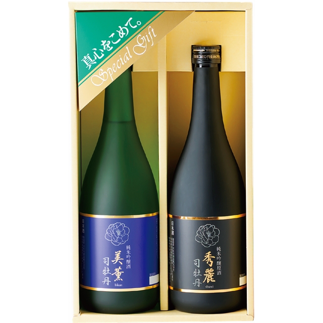 純米吟醸原酒「秀麗司牡丹」と純米吟醸酒「美薫司牡丹」のセット。優雅で繊細な吟醸香と、滑らかでソフトな旨味と、丸みのある酸味が味わいに奥行きを与える。