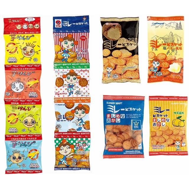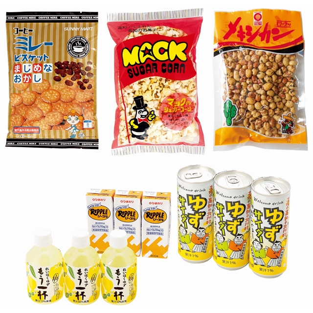 ■4連ミレービスケット(ミレーちゃん)■芋けんぴ4連■マックシュガーコーン(70g)■ミレービスケット(海洋深層水塩使用ミレー)(170g)、(ゆず塩味)(156g)、(トリュフ風味)(130g)、(コーヒー風味)(150g)、(塩バター風味)(120g)■メキシカン(125g)■リープル(200ml)×3■れいほくゆずもう一杯(280ml)×3■ゆずサイダー(250ml)×3