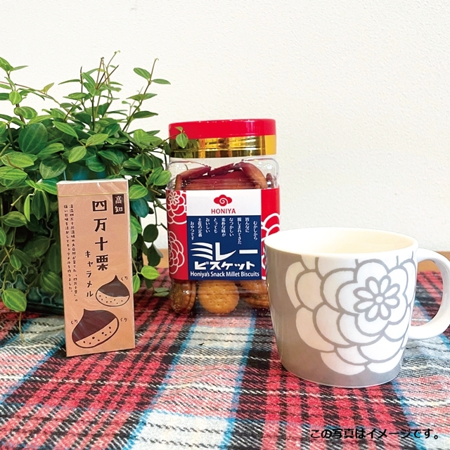 新色グレージュのほにやマグカップとおやつのほっと一息くつろぎセット。四万十栗キャラメルの甘さと、なつかしいミレーで心もポカポカと体も温まります。